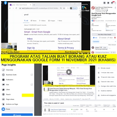 Perkongsian ini disiarkan secara langsung melalui “Facebook Page” Pusat Ekonomi Digital Keluarga Malaysia-PEDi di mana Pengurus Pusat Ekonomi Digital Desa Paya Mengkuang Pn.Nurul Iffah Binti Abu Bakar berkongsi Cara-cara buat borang atau kuiz menggunakan google form.