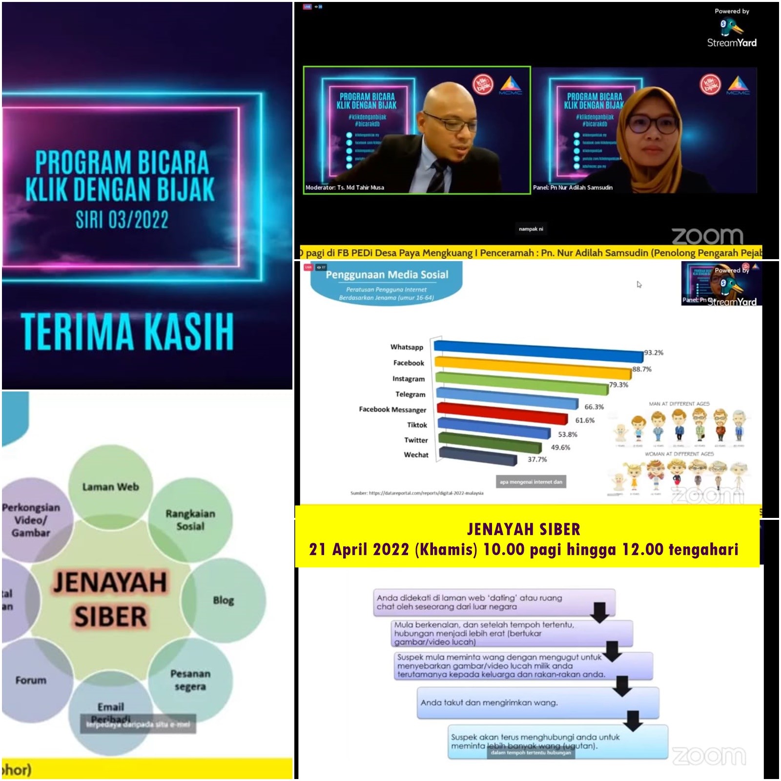• Menghebahkan saluran bantuan yang boleh dimanfaatkan jika berlaku jenayah siber.